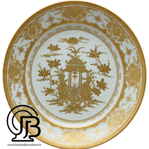 این تصویر یک بشقاب چینی را نشان میدهد که دارای طرحی طلایی رنگ است. این طرح با استفاده از نقوش گل و گیاه و همچنین یک ساختار پاگودا مانند در مرکز بشقاب تزئین شده است. حاشیهی بشقاب نیز با نقوش طلایی ظریف و پیچیدهای آراسته شده است که حس تجمل و ظرافت را القا میکند. پسزمینهی بشقاب سفید است که باعث میشود طرح طلایی به خوبی خودنمایی کند. این بشقاب رو به جلو و به صورت ایستاده نمایش داده شده است.