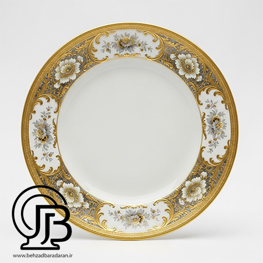 این بشقاب چینی، طرحی بسیار لوکس و کلاسیک دارد. حاشیههای پهن طلایی با نقوش پیچیده اسلیمی و گلهای طلایی و خاکستری، جلوهای فاخر به آن بخشیدهاند. این سبک طراحی یادآور ظروف برندهای معروفی مانند Falkenporzellan است که به دلیل جزئیات غنی و استفاده از طلا شناخته میشوند.