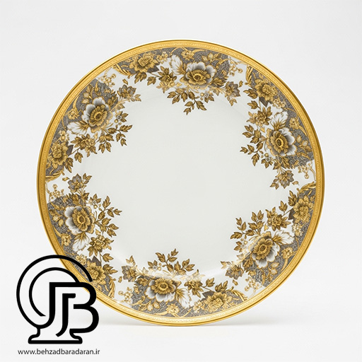این بشقاب چینی، طرحی کلاسیک و مجلل با نقوش گلدار طلایی و خاکستری در حاشیه دارد. گلها در این طرح بزرگتر و برجستهتر هستند. این بشقاب نیز حاشیه طلایی ضخیمی دارد و یادآور سبک ظروف Versace یا Williams Sonoma است.