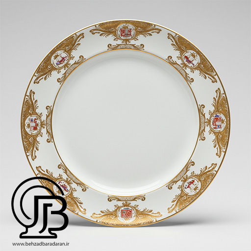 The overall design of the plate conveys formality and elegance. Decorations are mainly focused on the rim and, depending on the style (traditional gold/red or Wedgwood Prestige), include symmetrical motifs, royal emblems, or trophy-inspired and cameo elements. The white background highlights the decorations. The aim is to create a decorative and high-quality piece.